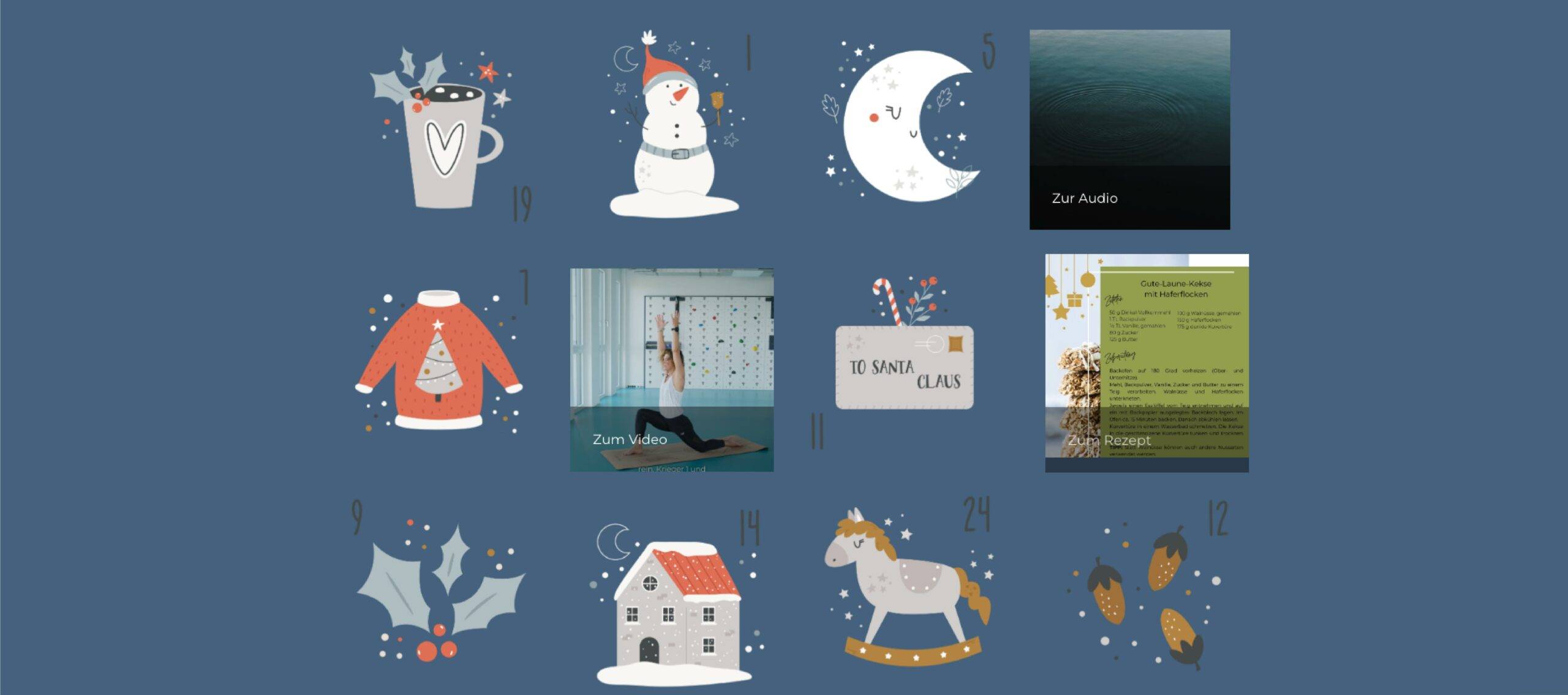 Bei der Auswahl der Inhalte haben wir bewusst auf Vielfalt und Alltagstauglichkeit geachtet, sodass jede:r mitmachen kann. Der Adventskalender bietet einen ausgewogenen Mix aus verschiedenen Bereichen der Gesundheitsförderung. Die Türchen beinhalten Impulse in Form von Videos, Audios oder kurzen Textbeiträgen.