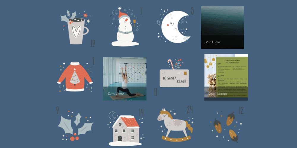 Bei der Auswahl der Inhalte haben wir bewusst auf Vielfalt und Alltagstauglichkeit geachtet, sodass jede:r mitmachen kann. Der Adventskalender bietet einen ausgewogenen Mix aus verschiedenen Bereichen der Gesundheitsförderung. Die Türchen beinhalten Impulse in Form von Videos, Audios oder kurzen Textbeiträgen.